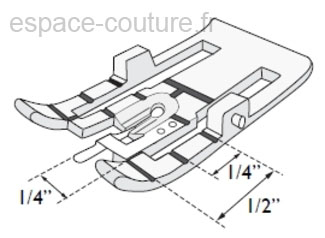 Utilisez le pied guide de quilting interchangeable lorsque vous piquez dans la couture le long d'une ligne de couture. Le pied comporte des lignes servant de guides pour pouvoir tourner facilement et avec précision dans les coins pour les coutures de 6 mm (¼) ou 3 mm (1/8).
